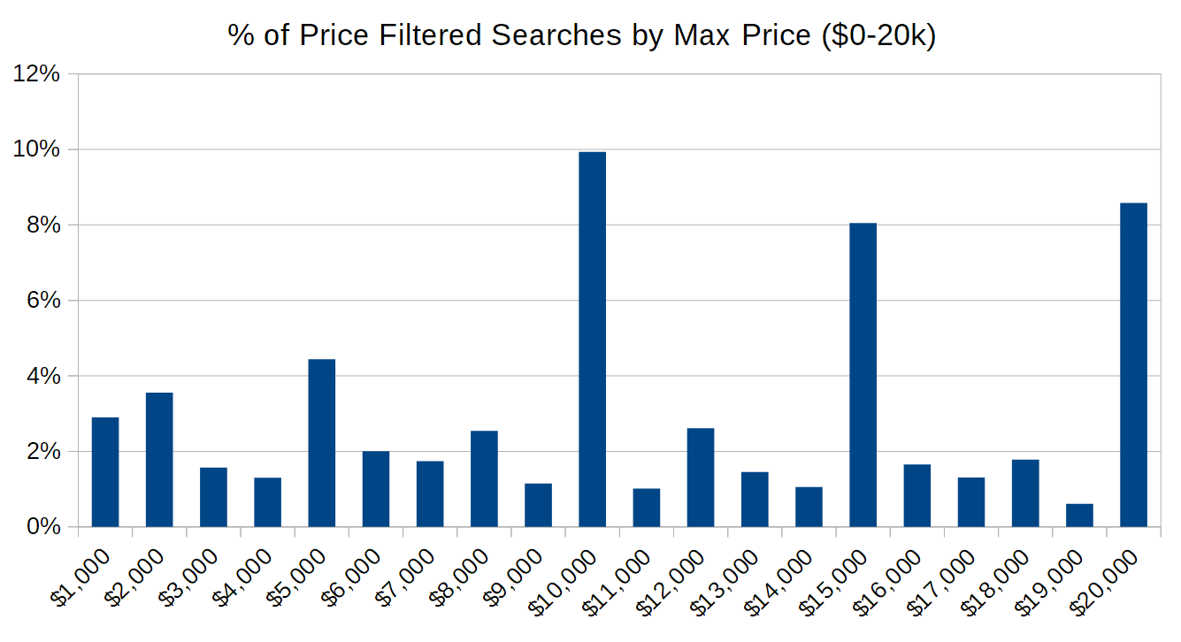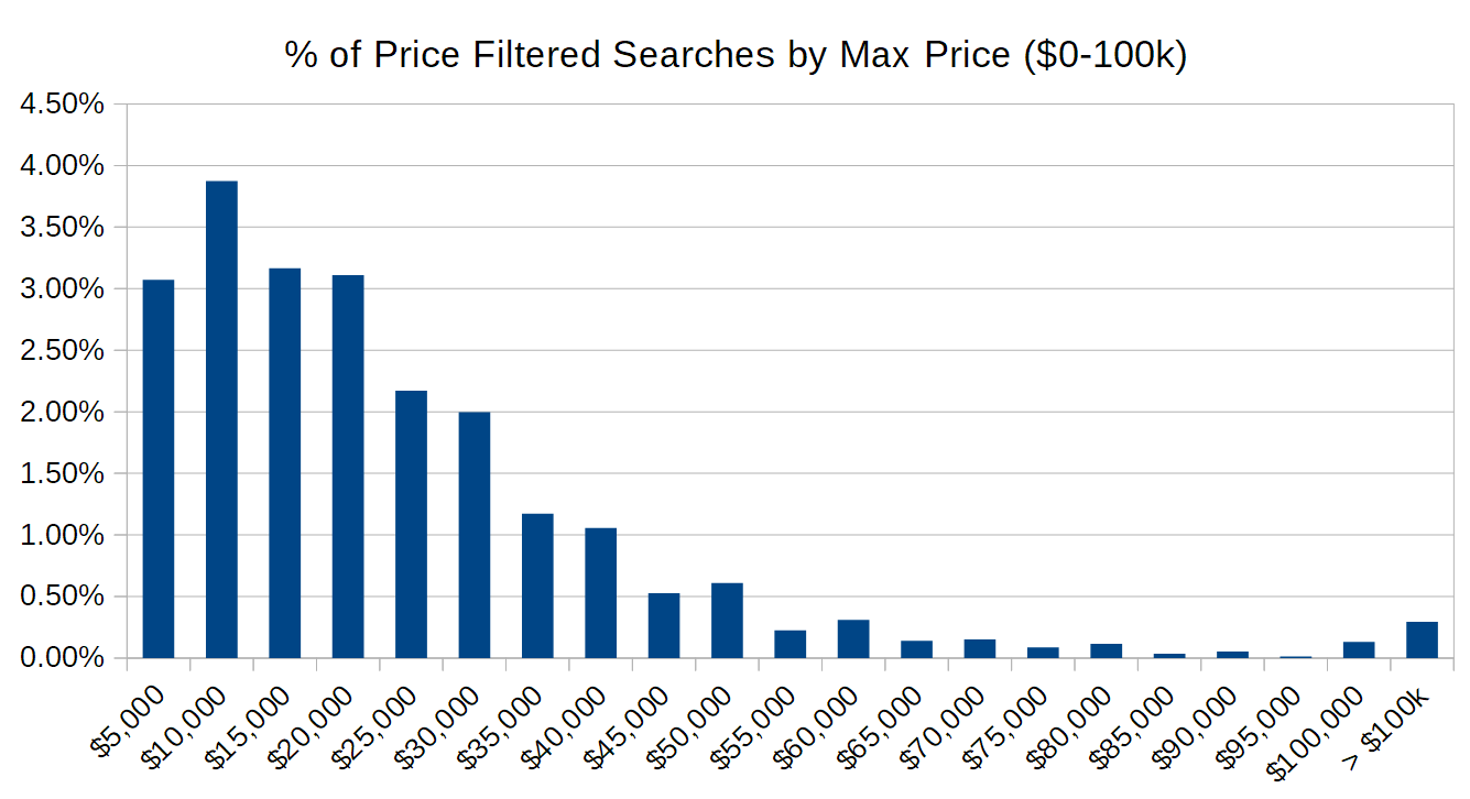 Interestingly, diesel is the most common filter for fuel type when a filter is applied. It’s a more common search filter than gas, hybrid, and electric vehicles. However, many more users are searching for specific electric vehicles such as Teslas, rather than using the EV filter. We expect both EV-filtered searches and searches for specific electric models will continue to grow as more automakers roll out new models. Remember that it’s super easy to find new and used EVs using the fuel type filter.