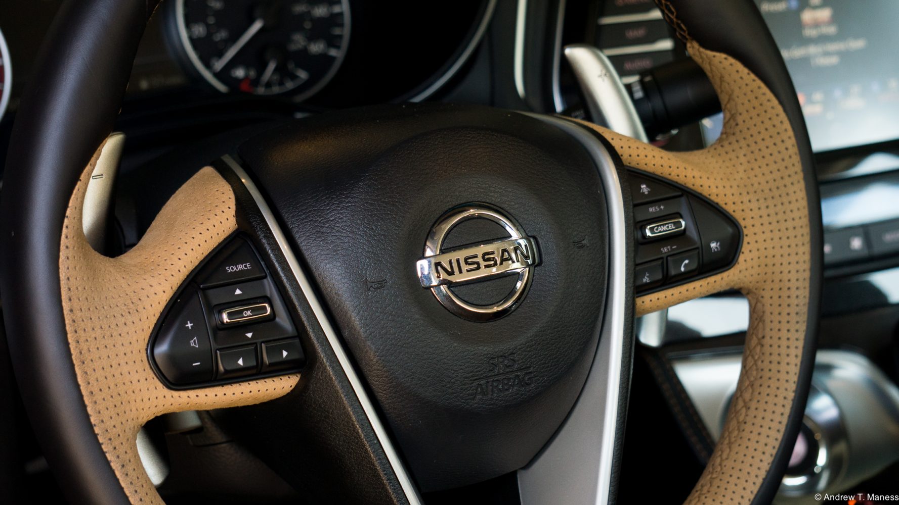 From the diamond quilted Alcantara seating, to the soft touch materials spread around throughout the cabin, the Maxima is clearly a major leap forward for Nissan. If they were to apply this kind of styling to the cabin of the GT-R and the next “Z”, they’d silence a-whole-lot of haters in one foul swoop. It speaks volumes that the steering wheel in this mid-size family sedan puts that of their halo car to shame. In fact, the flat bottomed wheel would be right at home in many premium sports cars and dare I say a number of super cars as well. The perforated Camel Alcantara perfectly contrasts the black leather trim around the edge and compliments the two-tone appearance in the rest of the cabin.