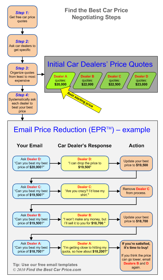 Email each car dealer and ask them, “Can you beat this price?” (get an email template here). Work your way down the list of dealers starting with the one who provided the most expensive quote. As you ask each dealer to beat your best offer, be sure to keep updating that “best offer” each time a dealer responds with a new, lower price.