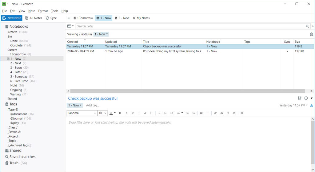 More recently I’ve also added the ‘Tomorrow’ and ‘Ongoing’ notebooks for stuff that’s happening but can’t be ‘done’ immediately, and so I don’t want it cluttering Now.3 Once something is done, it goes, unsurprisingly, in ‘Done’. I’ve also created an ‘Obsolete’ folder there, for anything that isn’t done, but is no longer relevant. (I prefer that to just deleting things, because you never know when you’ll want to look back to remember something.)