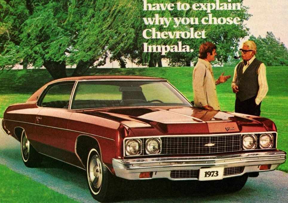 Of the various models, my favorite is easily the Custom Coupe. I like the pillar less Sport Sedan, and of course I have a soft sport for the station wagon, but the Custom Coupe embodies the spirit of the era the most. The 70s were all about personal luxury, and the Impala Custom Coupe dialed it up to 11. The ’73 models had an updated suspension and frame that offered up a buttery smooth ride said to have been comparable to that of a Cadillac Eldorado. Rather than stay with the cheaper matte black plastic steering wheel found in ’71 and ’72 models, the ’73 Impala had a interior color matched wheel and instrument panel. The slick shifting Turbo Hydra-matic tranmission, front disc brakes, and increased front legroom only further made the case that the Impala was a luxury contender with a modest price tag. It still upheld the classic sales mantra “Lets you know you’re the boss”, and I suspect that in a time when many people felt the weight of the world on their shoulders, an cushy interior of an Impala was just the escape they needed.