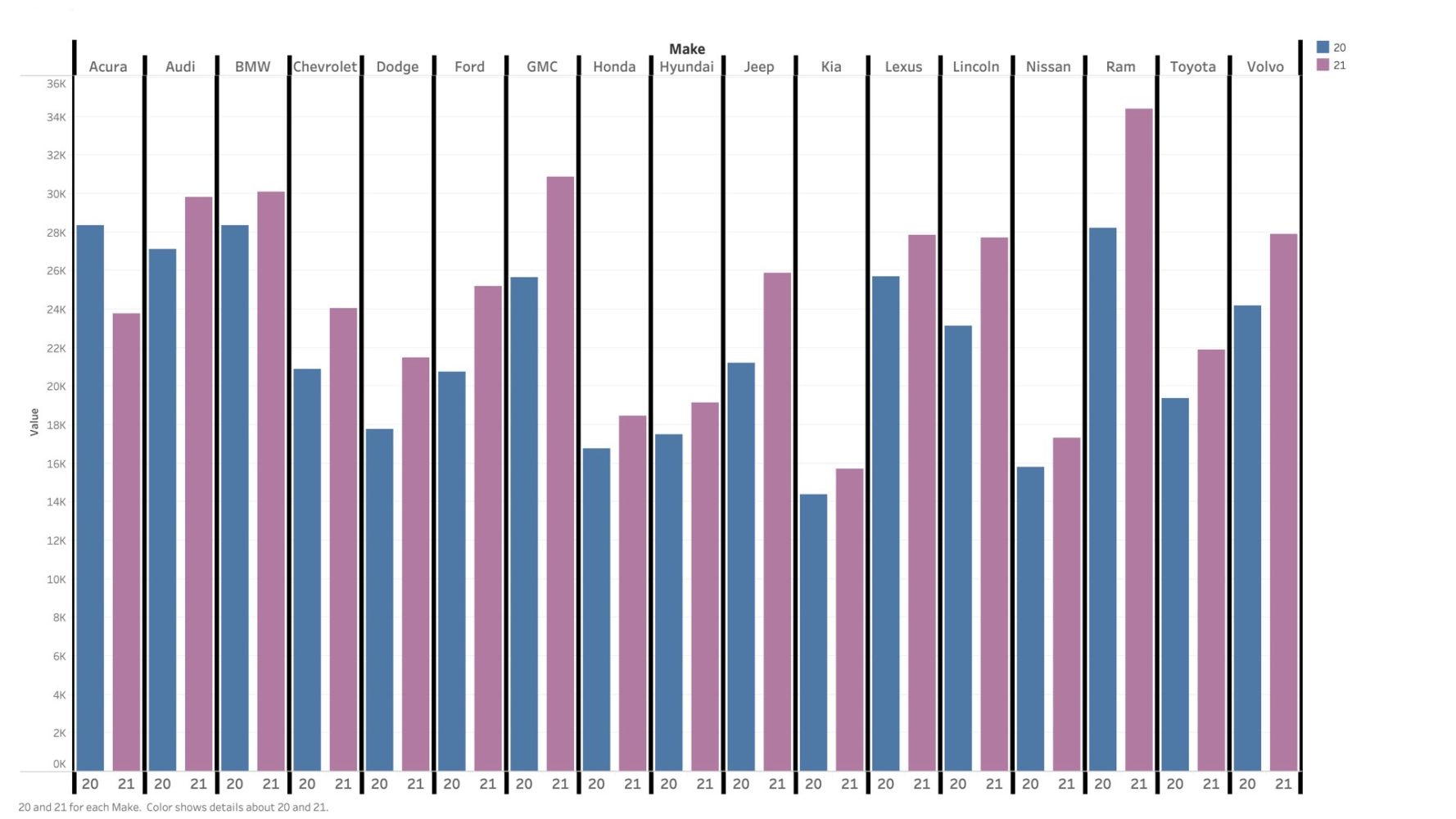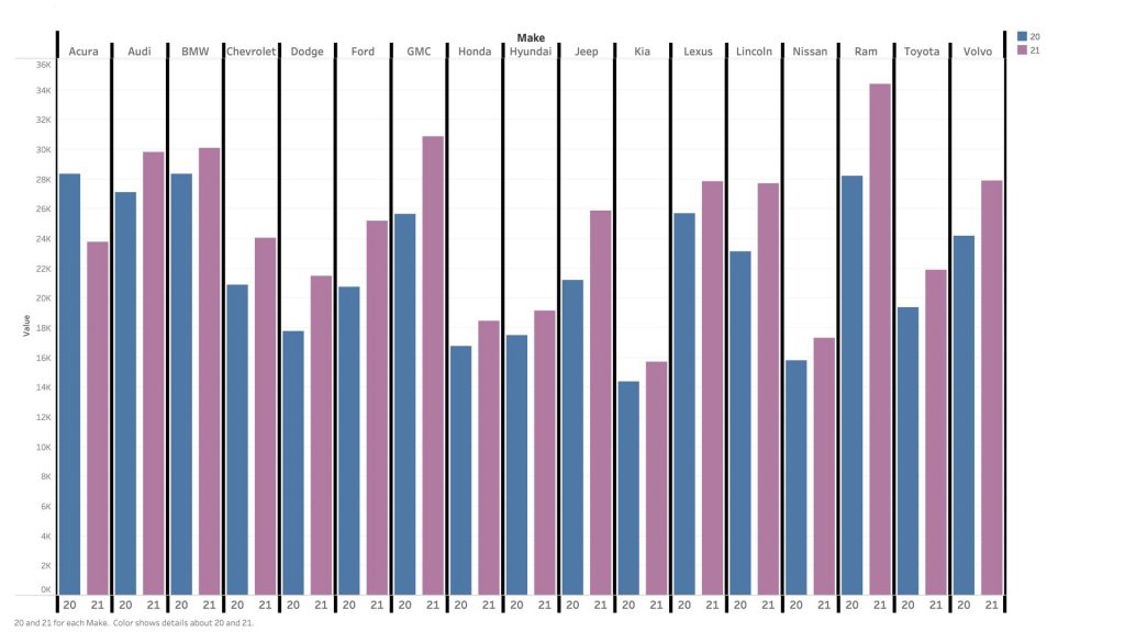 The table below shows average listing prices for used cars across 17 makes. AutoTempest observed listing prices for both 2020 and 2021 year-to-date, so both reflect information as of April. All but one make – Acura – saw increases. On average, pricing increased 13 percent from 2020 to 2021.